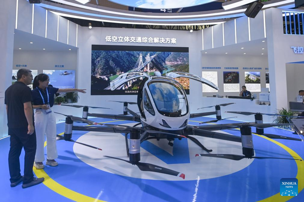 HANGZHOU, 25 septiembre, 2024 (Xinhua) -- Un visitante aprende sobre un avión sin conductor en la Zona de Movilidad Inteligente durante la III Exposición Global de Comercio Digital, en Hangzhou, provincia de Zhejiang, en el este de China, el 25 de septiembre de 2024. La III Exposición Global de Comercio Digital, inaugurada el miércoles en Hangzhou, presenta las más recientes innovaciones tecnológicas y el desarrollo empresarial del sector de la economía digital. Con el tema "Comercio digital, acceso global", la edición de este año ha atraído a más de 1.500 empresas nacionales y extranjeras, entre las cuales, una cifra superior a 300 son compañías internacionales. Igualmente, el número de compradores inscritos para el evento sobrepasa los 30.000 y más de 6.000 de ellos proceden de regiones y países extranjeros. (Xinhua/Huang Zongzhi)