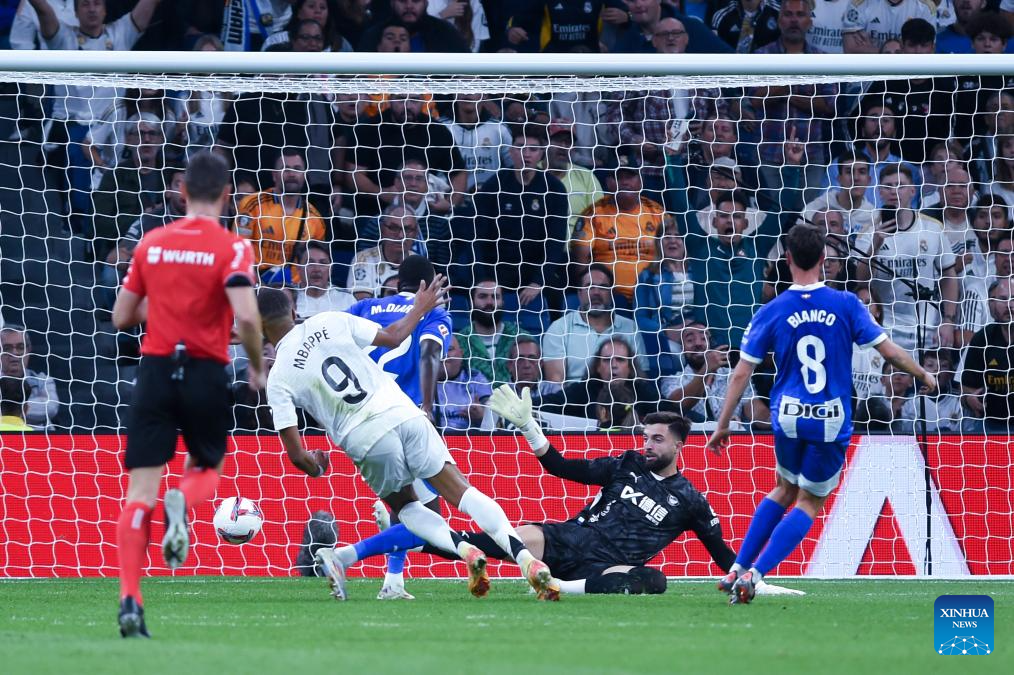 MADRID, 25 septiembre, 2024 (Xinhua) -- Imagen del 24 de septiembre de 2024 de Kylian Mbappé (2-i), de Real Madrid, realizando una anotación durante un partido de fútbol de La Liga entre Real Madrid y Alavés, en Madrid, España. (Xinhua/Gustavo Valiente)