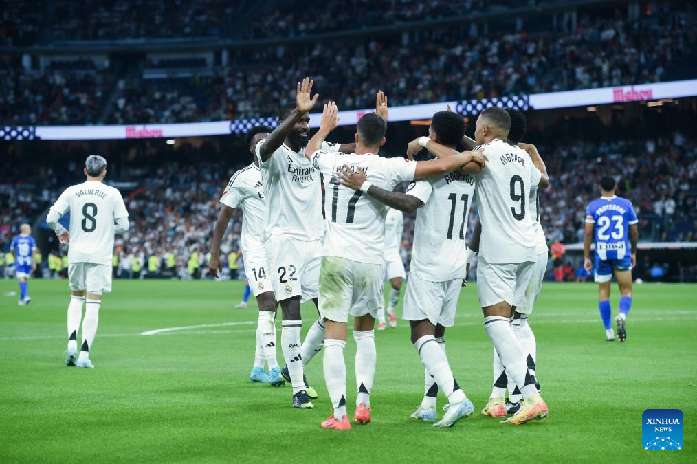 MADRID, 25 septiembre, 2024 (Xinhua) -- Imagen del 24 de septiembre de 2024 de jugadores de Real Madrid festejando una anotación durante un partido de fútbol de La Liga entre Real Madrid y Alavés, en Madrid, España. (Xinhua/Gustavo Valiente)