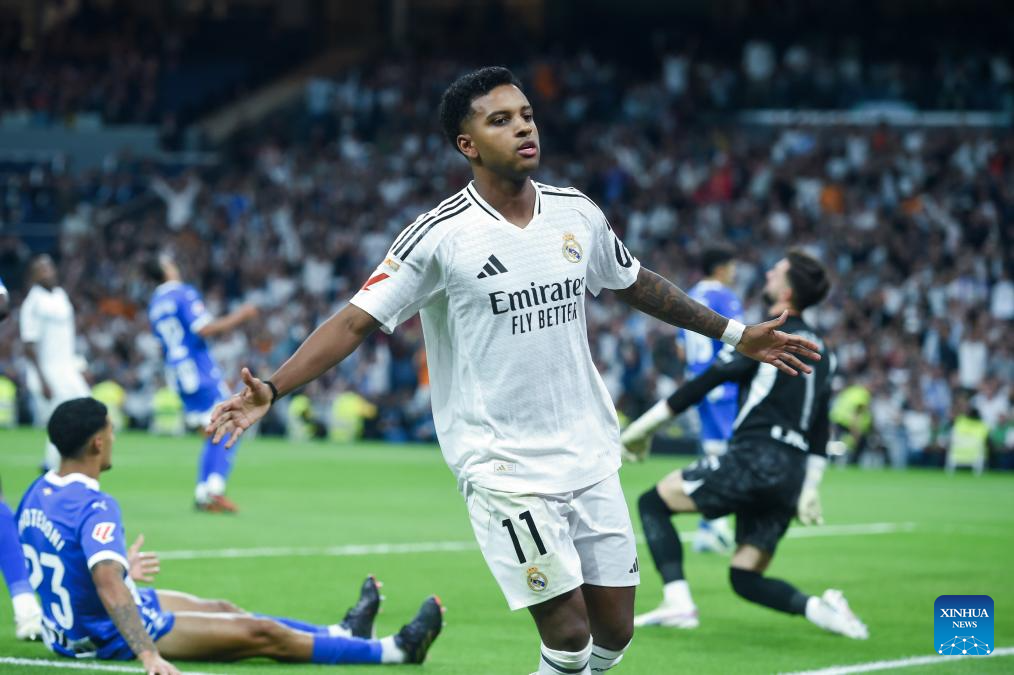 MADRID, 25 septiembre, 2024 (Xinhua) -- Imagen del 24 de septiembre de 2024 de Rodrygo, de Real Madrid, festejando su anotación durante un partido de fútbol de La Liga entre Real Madrid y Alavés, en Madrid, España. (Xinhua/Gustavo Valiente)
