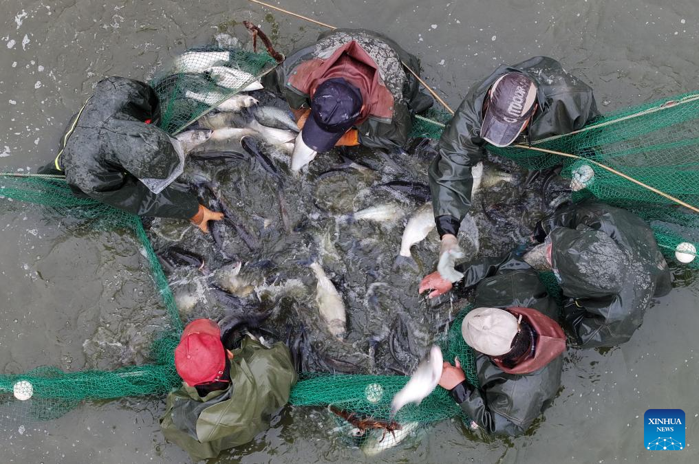 YINCHUAN, 25 septiembre, 2024 (Xinhua) -- Imagen tomada con un dron el 20 de septiembre de 2024 de personal capturando peces en una base de acuicultura, en el distrito de Helan, Yinchuan, en la región autónoma hui de Ningxia, en el noroeste de China. En los últimos años, las ciudades de Yinchuan y Qingtongxia en Ningxia han logrado transformar las tierras salina-alcalinas en áreas de plantación y cultivo. (Xinhua/Yang Zhisen)