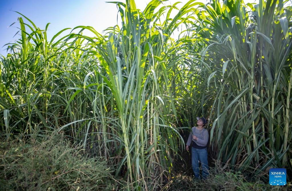 YINCHUAN, 25 septiembre, 2024 (Xinhua) -- Imagen del 23 de septiembre de 2024 de un trabajador revisando pasto Juncao creciendo en el terreno salino-alcalino mejorado, en la ciudad de Qingtongxia, en la región autónoma hui de Ningxia, en el noroeste de China. En los últimos años, las ciudades de Yinchuan y Qingtongxia en Ningxia han logrado transformar las tierras salina-alcalinas en áreas de plantación y cultivo. (Xinhua/Yang Zhisen)