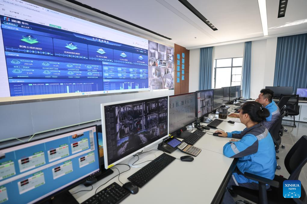 ANDING, 26 septiembre, 2024 (Xinhua) -- Imagen del 25 de septiembre de 2024 de trabajadores operando equipos de forma remota en la sala de control central de un proyecto de agregados de granito para la construcción en la mina Jiudingling, en el distrito de Anding, en la provincia de Hainan, en el sur de China. Un sistema de gestión de minas inteligente ha sido construido para el proyecto de agregados de granito para la construcción en la mina Jiudingling, lo que permite la producción digital de todo el proceso. Los operadores pueden monitorear varios datos indicadores en tiempo real de la mina y operar de forma remota equipos automatizados en la sala de control central. (Xinhua/Zhang Liyun)