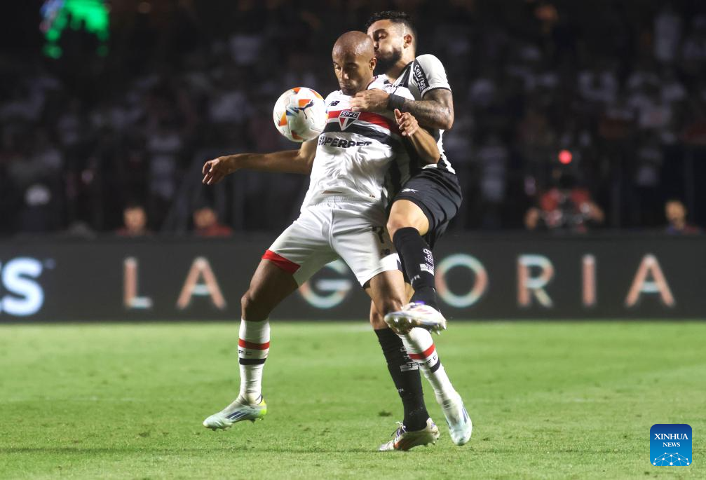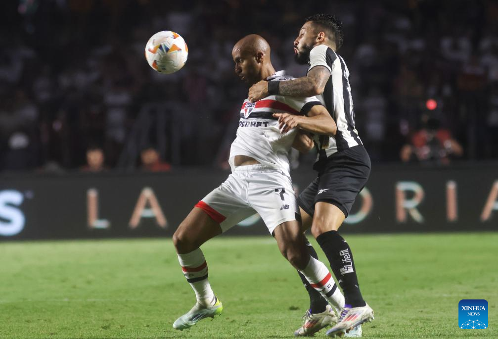 SAO PAULO, 26 septiembre, 2024 (Xinhua) -- Imagen del 25 de septiembre de 2024 del jugador Lucas (i), de Sao Paulo, disputando el balón con Alex Telles (d), de Botafogo, durante el partido de vuelta correspondiente a los cuartos de final de la Copa Conmebol Libertadores, celebrado en el Estadio Morumbi, en Sao Paulo, Brasil. (Xinhua/Rahel Patrasso)