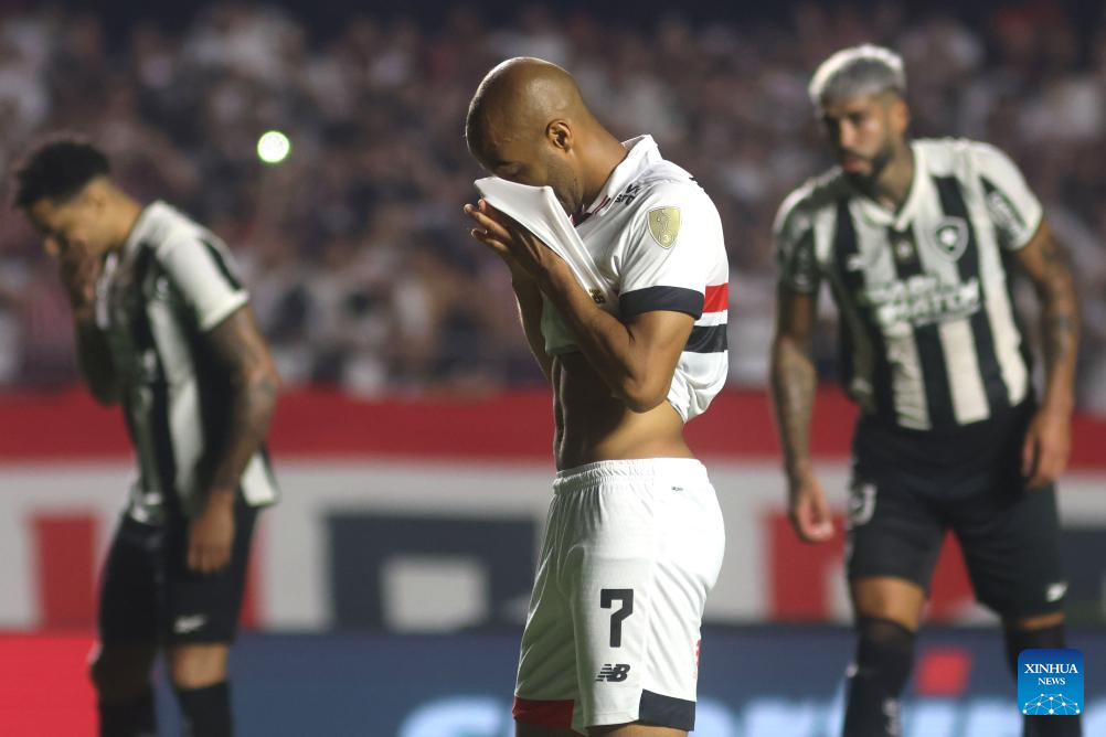 SAO PAULO, 26 septiembre, 2024 (Xinhua) -- Imagen del 25 de septiembre de 2024 del jugador Lucas, de Sao Paulo, reaccionando durante el partido de vuelta correspondiente a los cuartos de final de la Copa Conmebol Libertadores, ante Botafogo, celebrado en el Estadio Morumbi, en Sao Paulo, Brasil. (Xinhua/Rahel Patrasso)