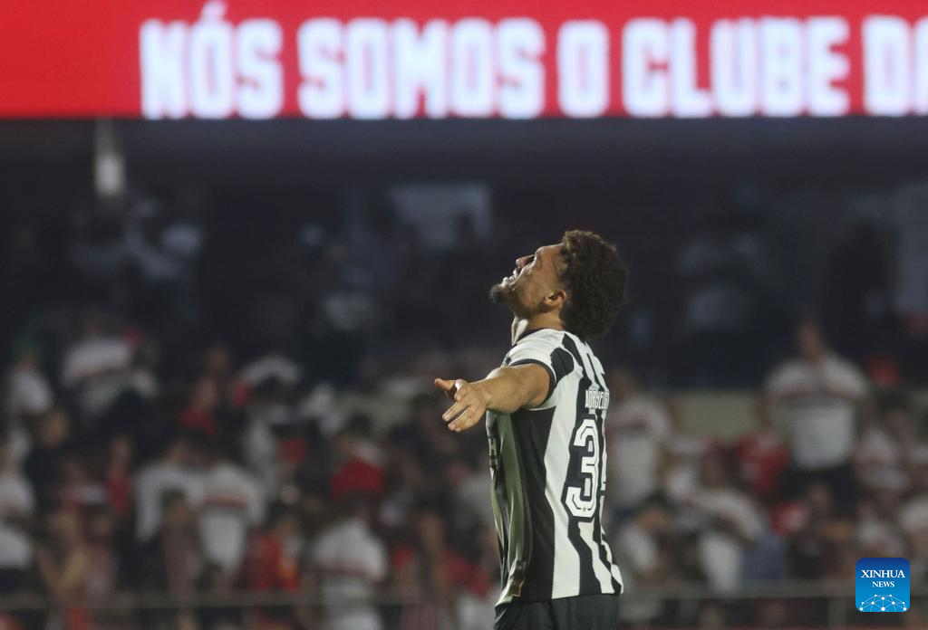 SAO PAULO, 26 septiembre, 2024 (Xinhua) -- Imagen del 25 de septiembre de 2024 del jugador Adryelson, de Botafogo, festejando la victoria, al término del partido de vuelta correspondiente a los cuartos de final de la Copa Conmebol Libertadores, ante Sao Paulo, celebrado en el Estadio Morumbi, en Sao Paulo, Brasil. (Xinhua/Rahel Patrasso)