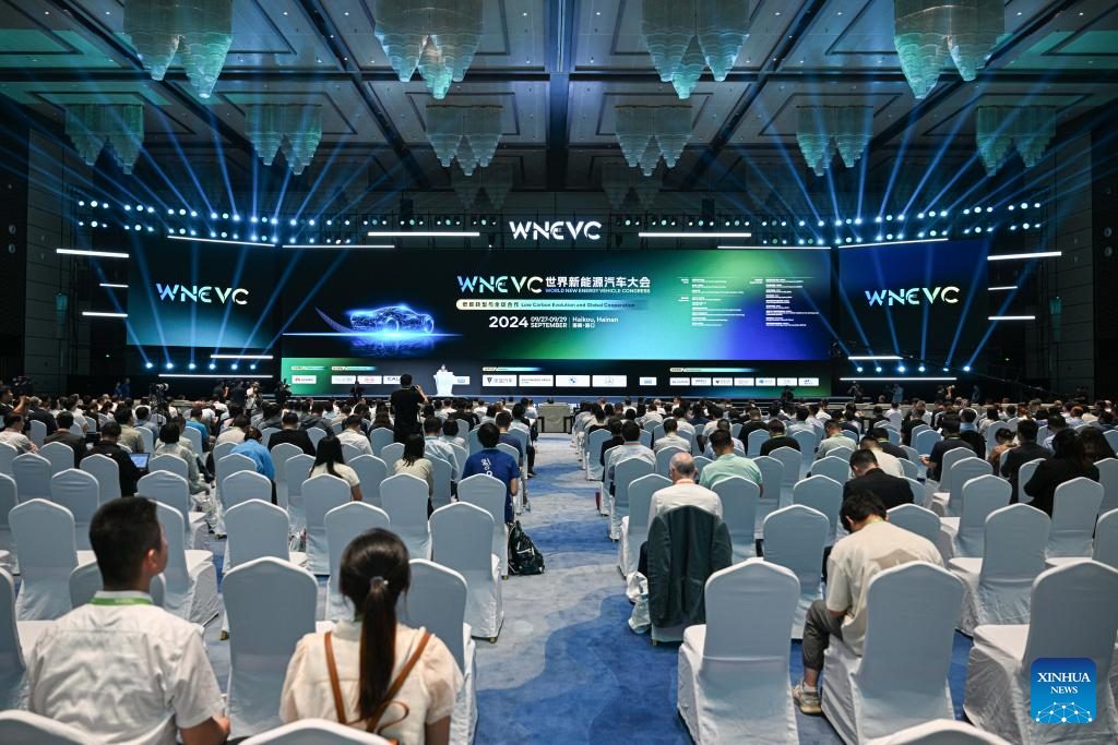HAIKOU, 27 septiembre, 2024 (Xinhua) -- Imagen del 27 de septiembre de 2024 de la Sesión Plenaria sobre NEV50@2035: El Camino para Enfrentar el Cambio Climático del Congreso Mundial de Vehículos de Nueva Energía 2024 (WNEVC, por sus siglas en inglés), en Haikou, en la provincia de Hainan, en el sur de China. El WNEVC 2024 comenzó el viernes en Haikou. Con el tema "Evolución Baja en Carbono y Cooperación Global", el evento de tres días de duración tiene como objetivo promover el desarrollo sostenible y saludable de los vehículos de nueva energía y fortalecer la cooperación global para lograr conjuntamente el objetivo de neutralidad de carbono. (Xinhua/Pu Xiaoxu)