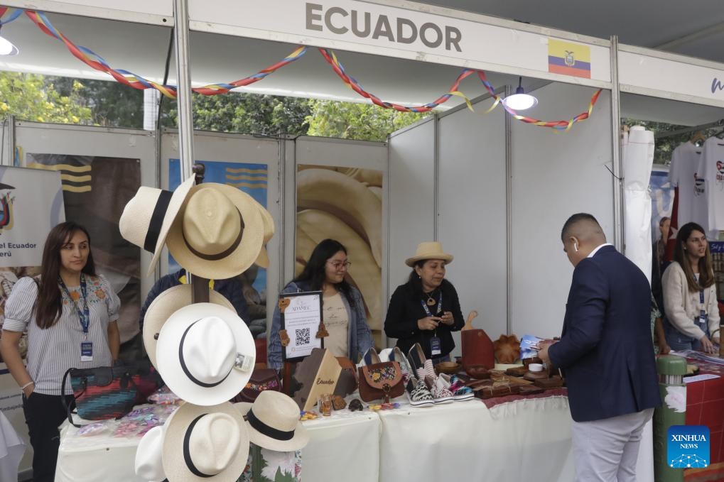 LIMA, 27 septiembre, 2024 (Xinhua) -- Una persona visita el estand de Ecuador en la II Feria Internacional de Cultura, Turismo y Educación, en el distrito de Miraflores, en Lima, Perú, el 27 de septiembre de 2024. (Xinhua/Mariana Bazo)