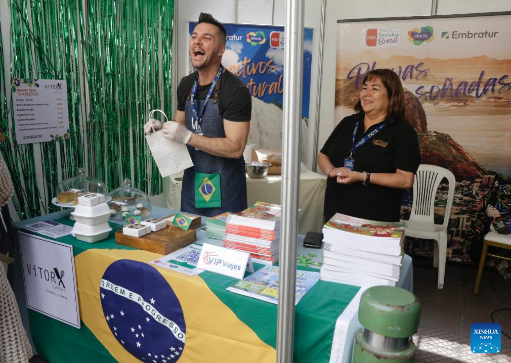 LIMA, 27 septiembre, 2024 (Xinhua) -- Personas atienden el estand de Brasil en la II Feria Internacional de Cultura, Turismo y Educación, en el distrito de Miraflores, en Lima, Perú, el 27 de septiembre de 2024. (Xinhua/Mariana Bazo)