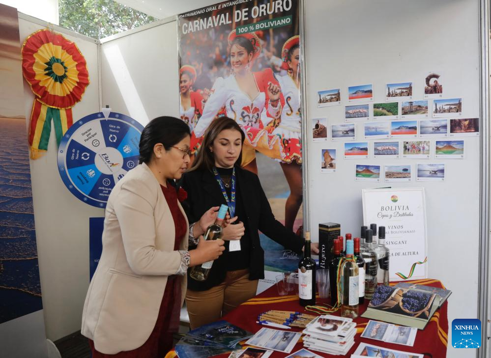 LIMA, 27 septiembre, 2024 (Xinhua) -- Personas atienden el estand de Bolivia en la II Feria Internacional de Cultura, Turismo y Educación, en el distrito de Miraflores, en Lima, Perú, el 27 de septiembre de 2024. (Xinhua/Mariana Bazo)