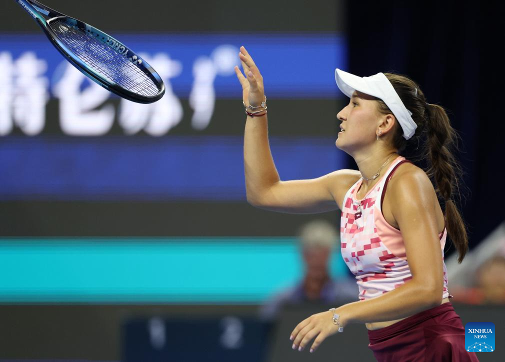 BEIJING, 28 septiembre, 2024 (Xinhua) -- Kamilla Rakhimova reaccionando durante el partido de segunda ronda de individuales femeninos entre Zheng Qinwen, de China y Kamilla Rakhimova, de Rusia, en el torneo de tenis Abierto de China 2024, en Beijing, capital de China, el 28 de septiembre de 2024. (Xinhua/Zhang Chenlin)