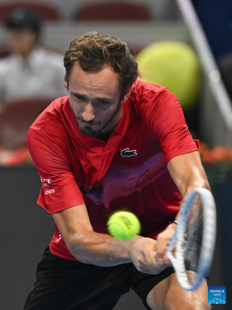 BEIJING, 28 septiembre, 2024 (Xinhua) -- Daniil Medvedev devuelve la pelota durante el partido de segunda ronda de individuales masculinos entre Daniil Medvedev de Rusia y Adrian Mannarino de Francia, en el torneo de tenis Abierto de China 2024, en Beijing, capital de China, el 28 de septiembre de 2024. (Xinhua/Zhang Long)