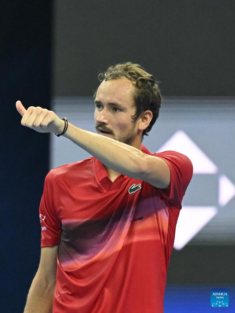 BEIJING, 28 septiembre, 2024 (Xinhua) -- Daniil Medvedev levanta el pulgar ante Adrian Mannarino durante el partido de segunda ronda de individuales masculinos entre Daniil Medvedev de Rusia y Adrian Mannarino de Francia, en el torneo de tenis Abierto de China 2024, en Beijing, capital de China, el 28 de septiembre de 2024. (Xinhua/Zhang Long)