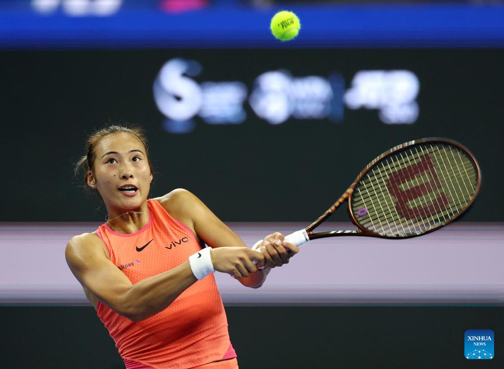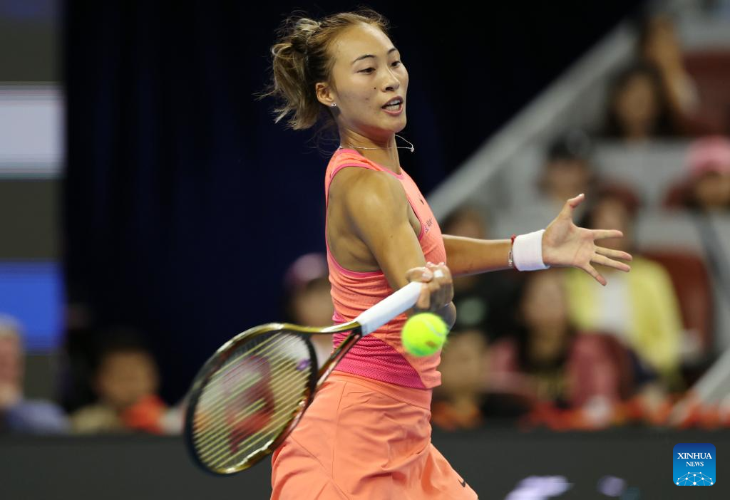 BEIJING, 28 septiembre, 2024 (Xinhua) -- Zheng Qinwen devuelve la pelota durante el partido de segunda ronda de individuales femeninos entre Zheng Qinwen, de China y Kamilla Rakhimova, de Rusia, en el torneo de tenis Abierto de China 2024, en Beijing, capital de China, el 28 de septiembre de 2024. (Xinhua/Zhang Chenlin)