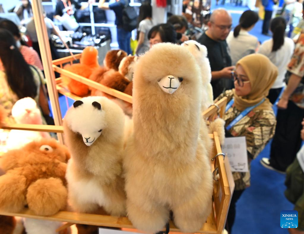 NANNING, 28 septiembre, 2024 (Xinhua) -- Juguetes de peluche de piel de alpaca peruana son exhibidos durante la 21ª Exposición China-ASEAN, en Nanning, en la región autónoma de la etnia zhuang de Guangxi, en el sur de China, el 28 de septiembre de 2024. Productos de los países de la Asociación de Naciones del Sudeste Asiático (ASEAN), como durianes, galletas y palo de rosa, así como de otros países como salchichas rusas y juguetes de peluche de piel de alpaca peruana han gozado de popularidad en la 21ª Exposición China-ASEAN de Nanning. (Xinhua/Zhou Hua)