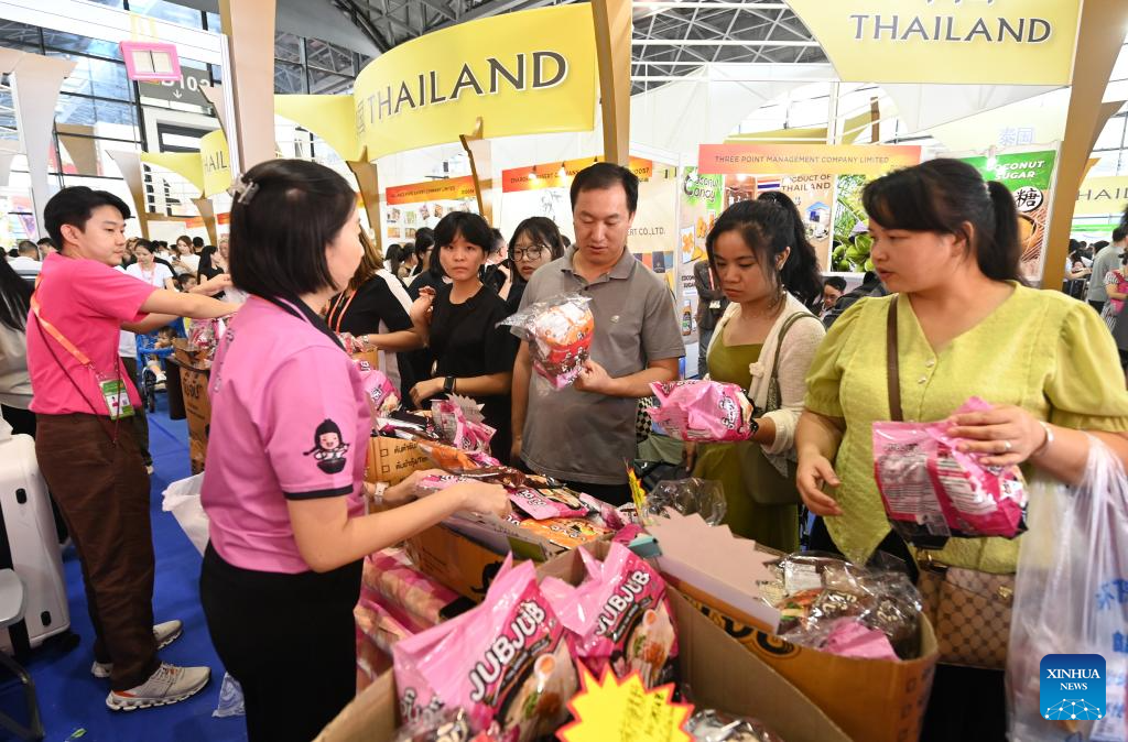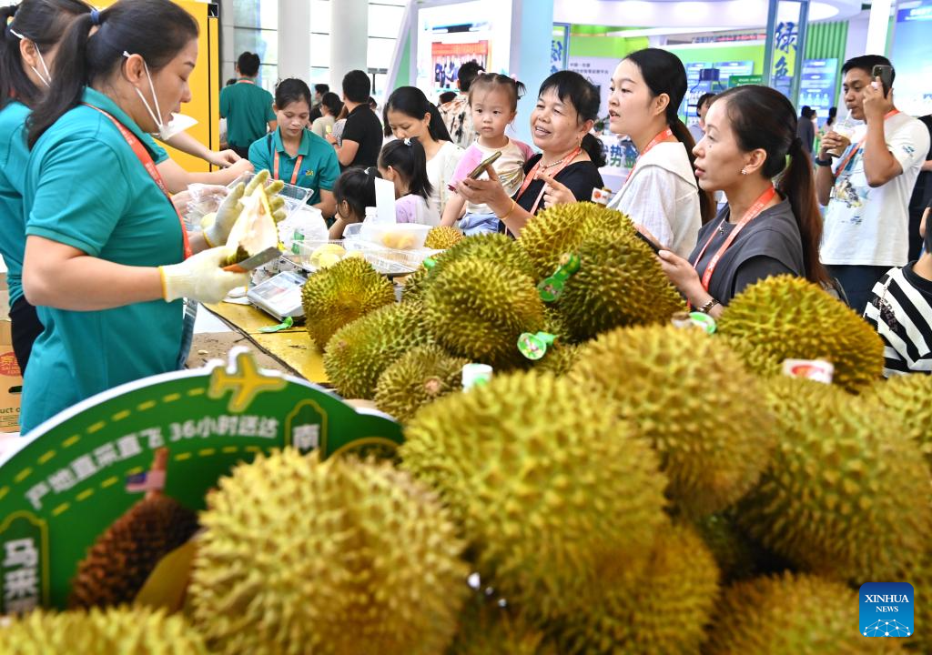 NANNING, 28 septiembre, 2024 (Xinhua) -- Visitantes compran productos de Tailandia durante la 21ª Exposición China-ASEAN en el Centro Internacional de Convenciones y Exposiciones de Nanning, en Nanning, en la región autónoma de la etnia zhuang de Guangxi, en el sur de China, el 28 de septiembre de 2024. Productos de los países de la Asociación de Naciones del Sudeste Asiático (ASEAN), como durianes, galletas y palo de rosa, así como de otros países como salchichas rusas y juguetes de peluche de piel de alpaca peruana han gozado de popularidad en la 21ª Exposición China-ASEAN de Nanning. (Xinhua/Lu Boan)