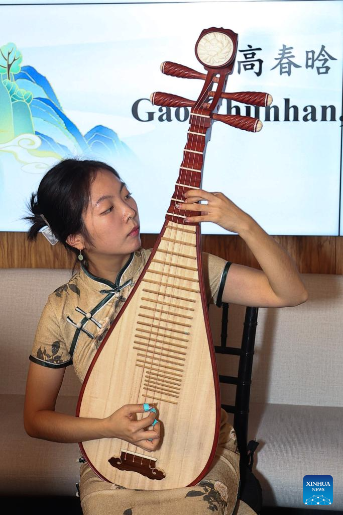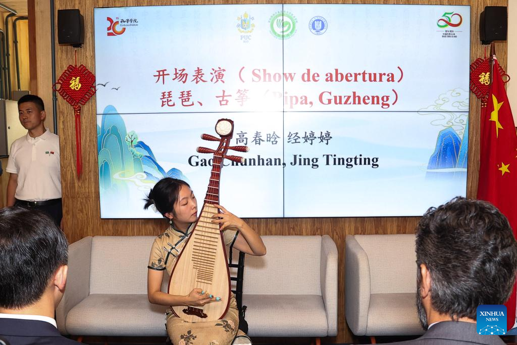 RIO DE JANEIRO, 28 septiembre, 2024 (Xinhua) -- Imagen del 26 de septiembre de 2024 de Gao Chunhan realizando una presentación en un instrumento musical chino llamado pipa durante la celebración del 20° aniversario del Instituto Confucio y el 13° aniversario del Instituto Confucio de la Pontificia Universidad Católica de Río de Janeiro, en Río de Janeiro, Brasil. (Xinhua/Claudia Martini)