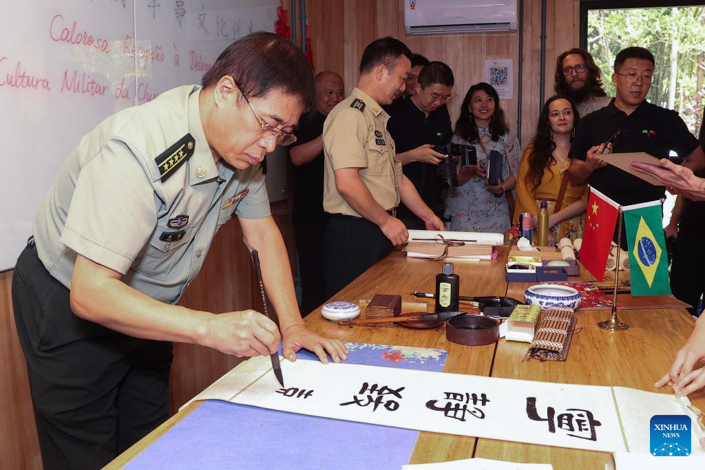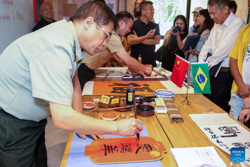 RIO DE JANEIRO, 28 septiembre, 2024 (Xinhua) -- Imagen del 26 de septiembre de 2024 de Zhang Ji (i), vicepresidente de la Asociación de Caligrafía China, practicando caligrafía china durante la celebración del 20° aniversario del Instituto Global Confucio y el 13° aniversario del Instituto Confucio de la Pontificia Universidad Católica de Río de Janeiro, en Río de Janeiro, Brasil. (Xinhua/Claudia Martini)