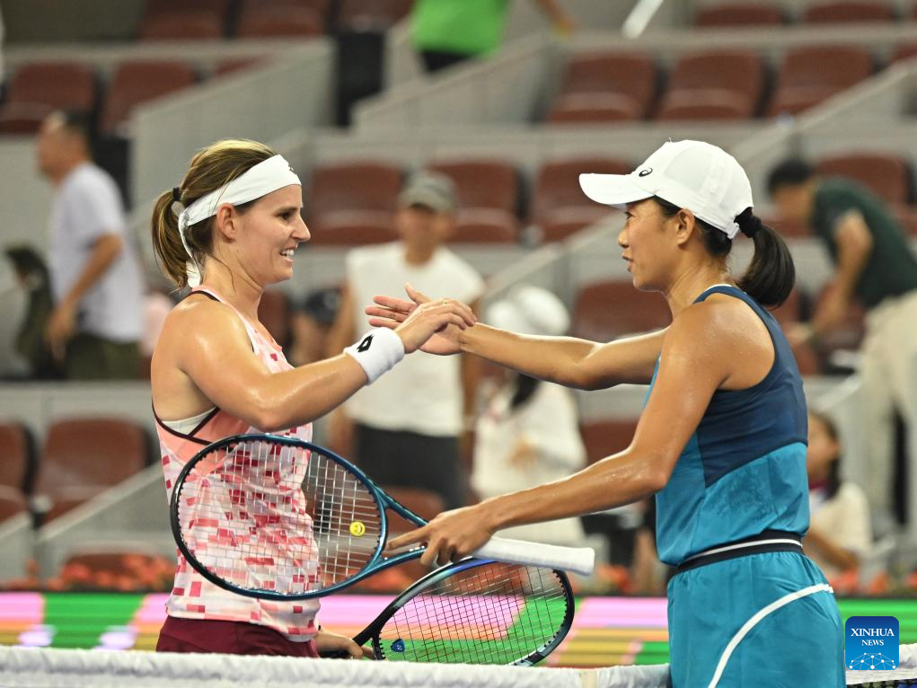 BEIJING, 29 septiembre, 2024 (Xinhua) -- Zhang Shuai (d) saluda a Greet Minnen al término del partido de la tercera ronda de individuales femeninos entre Zhang Shuai, de China, y Greet Minnen, de Bélgica, en el torneo de tenis Abierto de China 2024, en Beijing, capital de China, el 29 de septiembre de 2024. (Xinhua/Zhang Long)