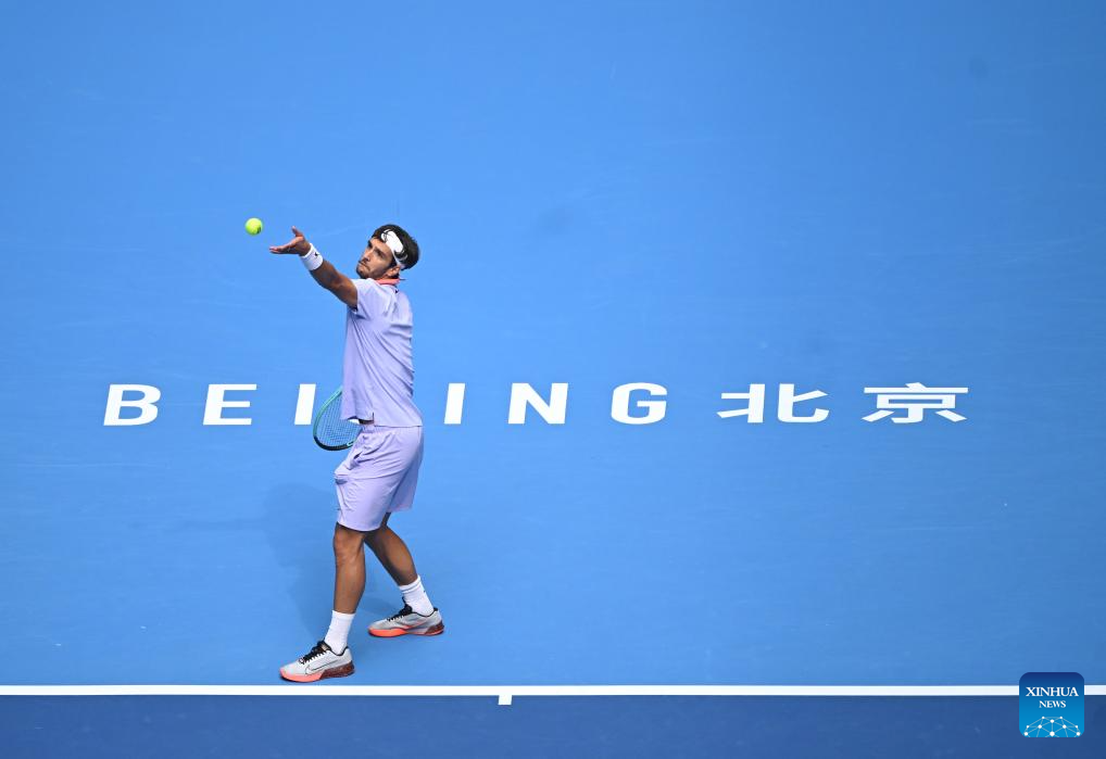 BEIJING, 29 septiembre, 2024 (Xinhua) -- Lorenzo Musetti sirve la pelota durante el partido de segunda ronda de individuales masculinos entre Bu Yunchaokete, de China, y Lorenzo Musetti, de Italia, en el torneo de tenis Abierto de China 2024, en Beijing, capital de China, el 29 de septiembre de 2024. (Xinhua/Zhang Long)