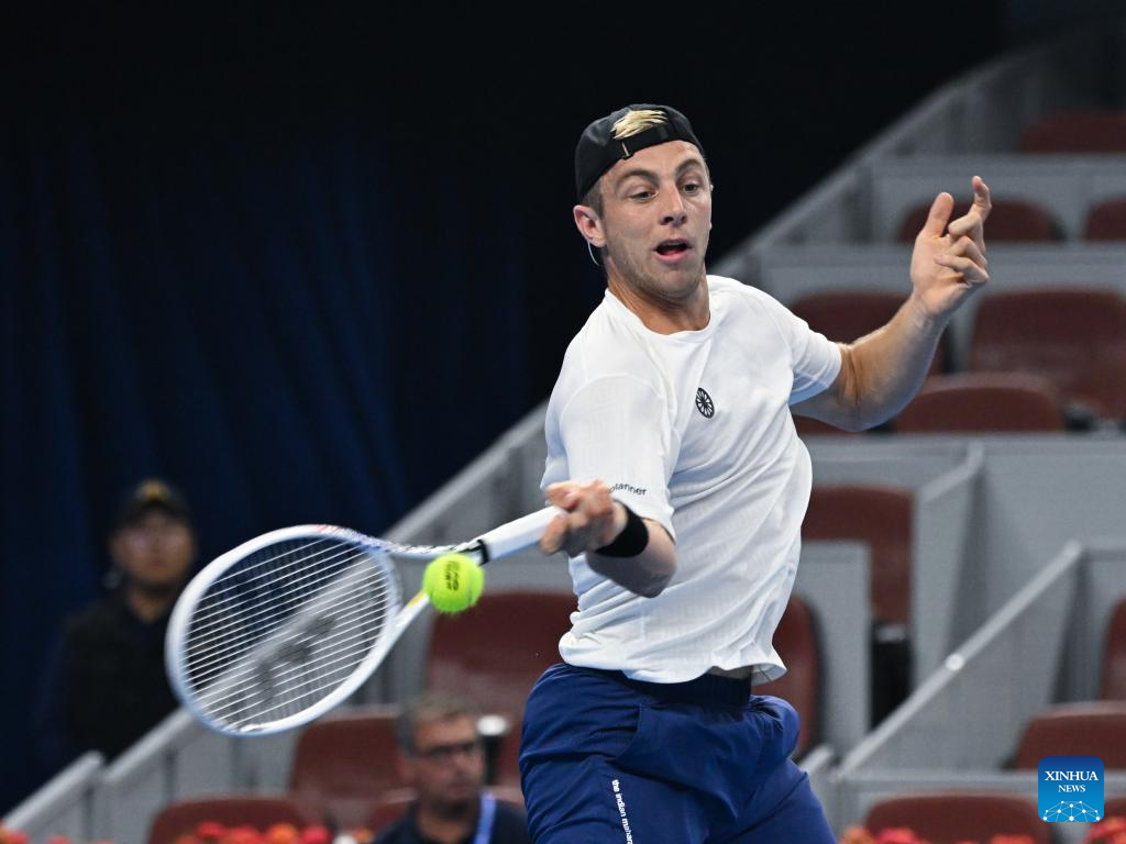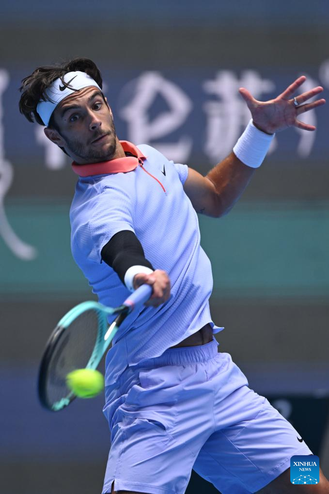 BEIJING, 29 septiembre, 2024 (Xinhua) -- Lorenzo Musetti devuelve la pelota durante el partido de segunda ronda de individuales masculinos entre Bu Yunchaokete, de China,y Lorenzo Musetti, de Italia, en el torneo de tenis Abierto de China 2024, en Beijing, capital de China, el 29 de septiembre de 2024. (Xinhua/Zhang Long)