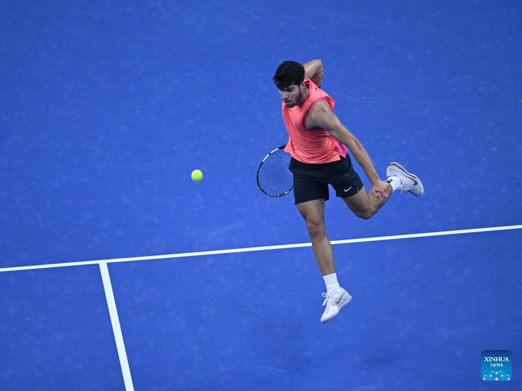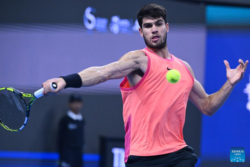 BEIJING, 29 septiembre, 2024 (Xinhua) -- Carlos Alcaraz devuelve la pelota durante el partido de segunda ronda de individuales masculinos entre Carlos Alcaraz, de España, y Tallon Griekspoor, de Países Bajos, en el torneo de tenis Abierto de China 2024, en Beijing, capital de China, el 29 de septiembre de 2024. (Xinhua/Zhang Long)