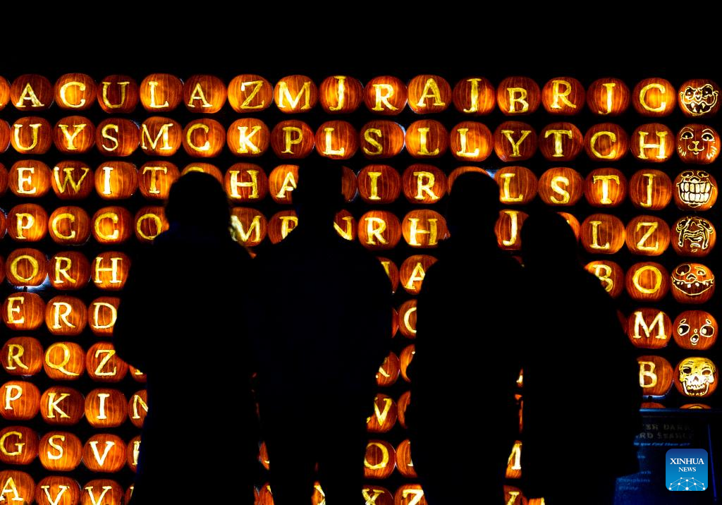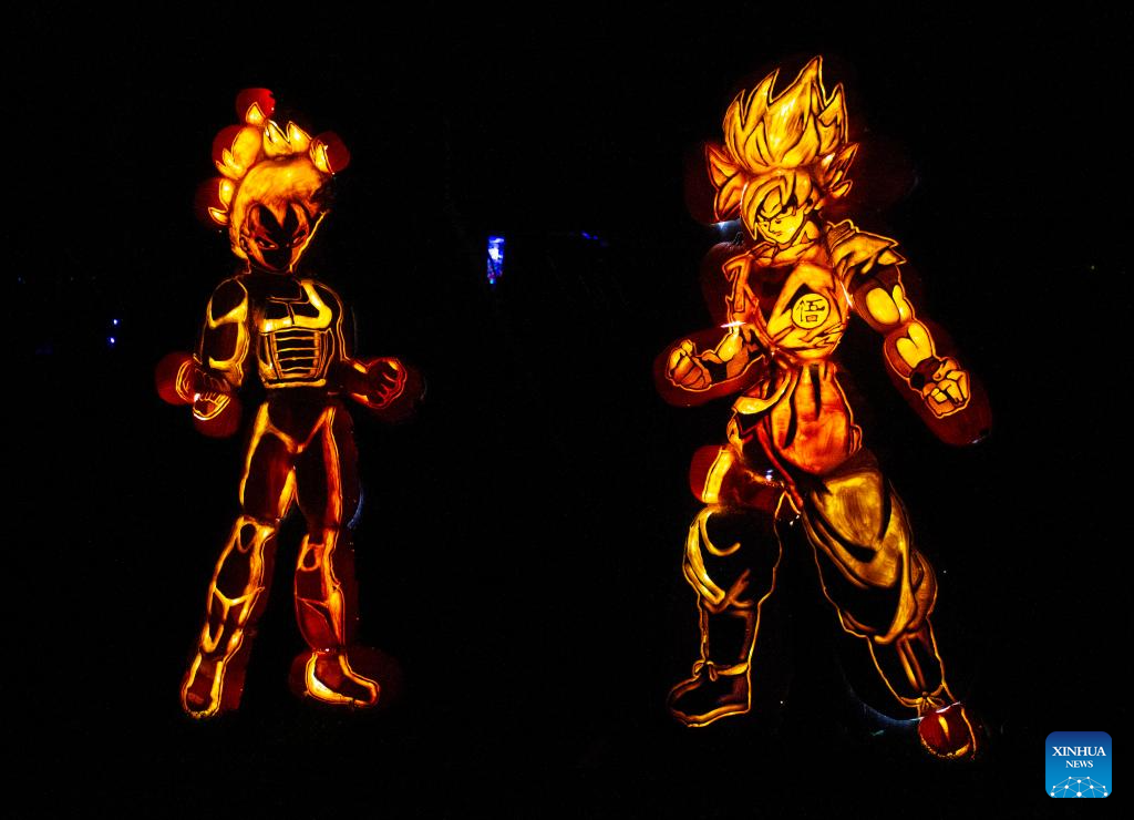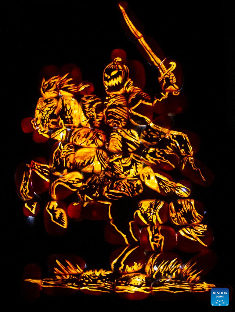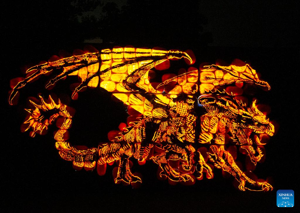 MILTON, 29 septiembre, 2024 (Xinhua) -- Imagen del 28 de septiembre de 2024 de una calabaza tallada vista durante el evento Calabazas Después de Oscurecer, en Milton, Ontario, Canadá. El evento de Halloween al aire libre comenzó el sábado y durará hasta el 30 de octubre este año. (Xinhua/Zou Zheng)