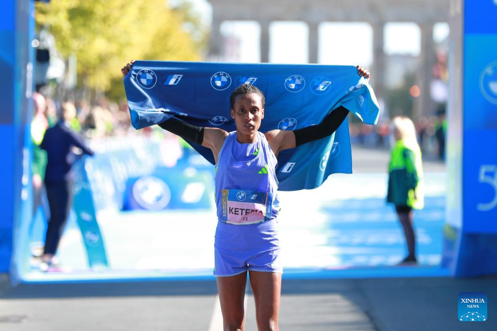 BERLIN, 29 septiembre, 2024 (Xinhua) -- Tigist Ketema, de Etiopía, festeja su victoria en la carrera femenina del Maratón de Berlín 2024, en Berlín, capital de Alemania, el 29 de septiembre de 2024. (Xinhua/Du Zheyu)