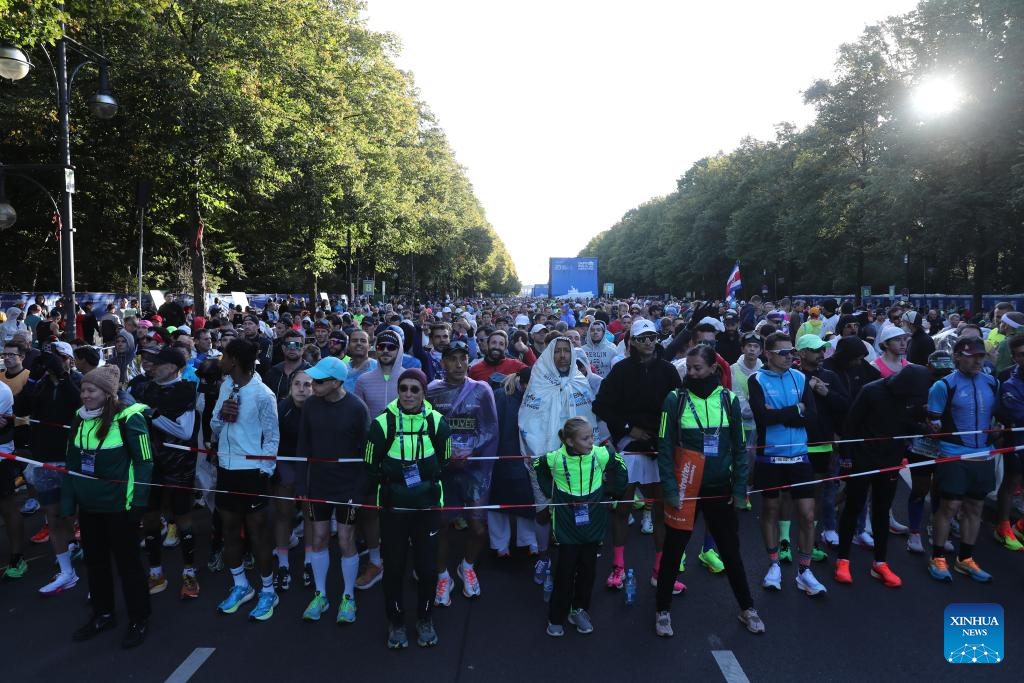 BERLIN, 29 septiembre, 2024 (Xinhua) -- Participantes esperan previo al inicio del Maratón de Berlín 2024, en Berlín, capital de Alemania, el 29 de septiembre de 2024. (Xinhua/Du Zheyu)