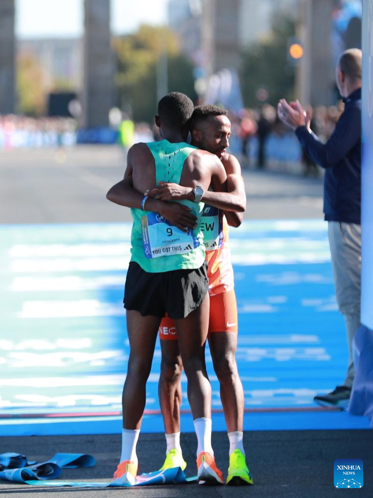 BERLIN, 29 septiembre, 2024 (Xinhua) -- El ganador Mikesa Mengesha (i), de Etiopía, se abraza con el tercer lugar Haymanot Alew, de Etiopía, después de la carrera masculina del Maratón de Berlín 2024, en Berlín, capital de Alemania, el 29 de septiembre de 2024. (Xinhua/Du Zheyu)