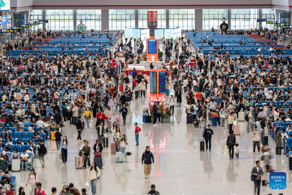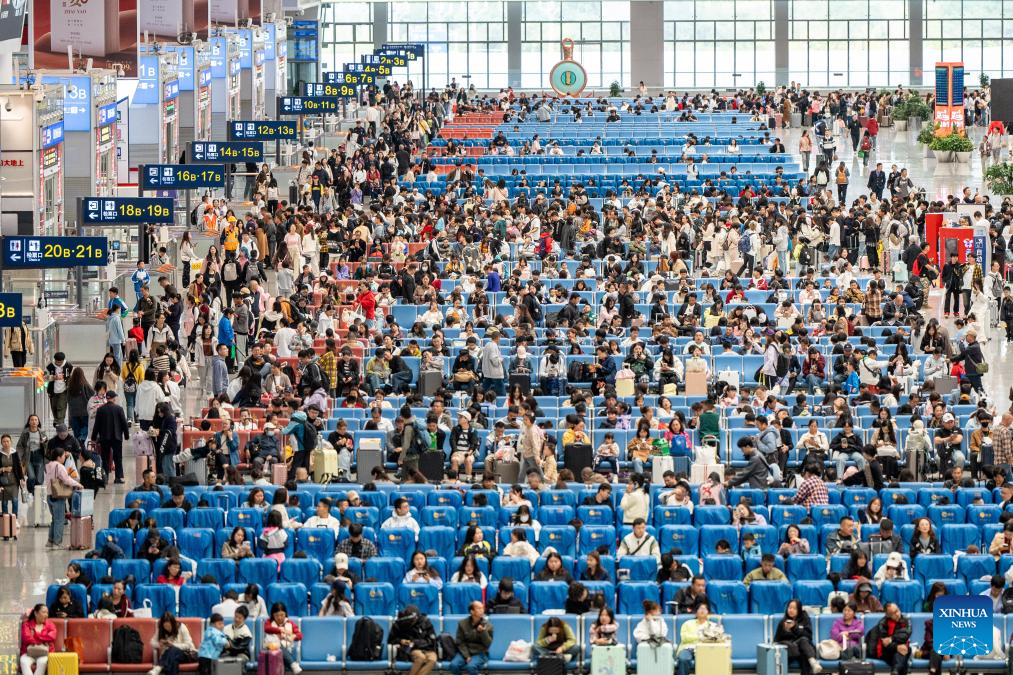 BEIJING, 1 octubre, 2024 (Xinhua) -- Pasajeros son vistos en una sala de espera de la Estación de Ferrocarril del Norte de Guiyang, en Guiyang, en la provincia de Guizhou, en el suroeste de China, el 1 de octubre de 2024. El martes marca el primer día de vacaciones con motivo del Día Nacional de China. Se espera que China gestione 175 millones de viajes de ferrocarril durante la temporada alta vacacional de diez días de duración, que van del 29 de septiembre al 8 de octubre, de acuerdo con China State Railway Group Co. (Xinhua/Long Jianrui)