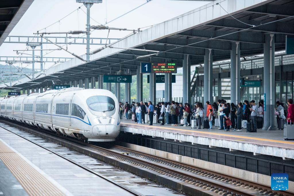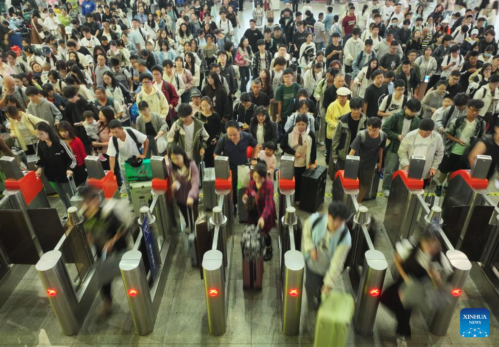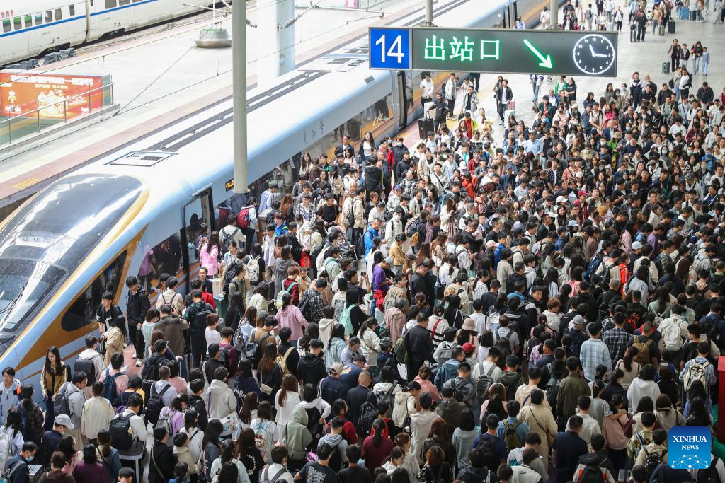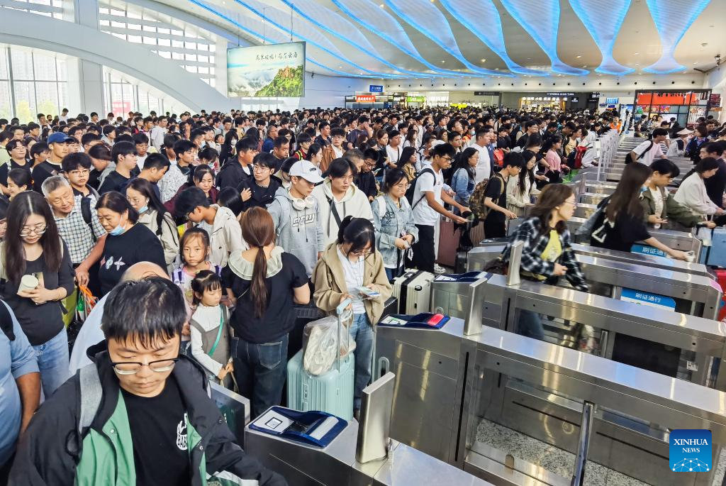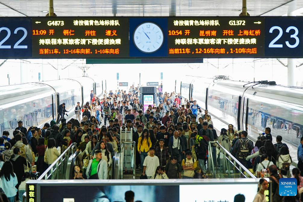 BEIJING, 1 octubre, 2024 (Xinhua) -- Pasajeros descienden de trenes en la Estación de Ferrocarril del Norte de Guiyang, en Guiyang, en la provincia de Guizhou, en el suroeste de China, el 1 de octubre de 2024. El martes marca el primer día de vacaciones con motivo del Día Nacional de China. Se espera que China gestione 175 millones de viajes de ferrocarril durante la temporada alta vacacional de diez días de duración, que van del 29 de septiembre al 8 de octubre, de acuerdo con China State Railway Group Co. (Xinhua/Liu Xu)
