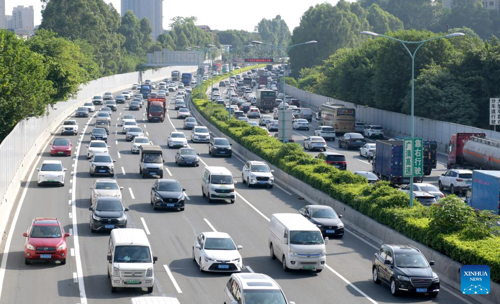 BEIJING, 1 octubre, 2024 (Xinhua) -- Vehículos circulan por una autopista urbana, en Guangzhou, en la provincia de Guangdong, en el sur de China, el 1 de octubre de 2024. El martes marca el primer día de vacaciones con motivo del Día Nacional de China. Se espera que China gestione 175 millones de viajes de ferrocarril durante la temporada alta vacacional de diez días de duración, que van del 29 de septiembre al 8 de octubre, de acuerdo con China State Railway Group Co. (Xinhua/Lu Hanxin)