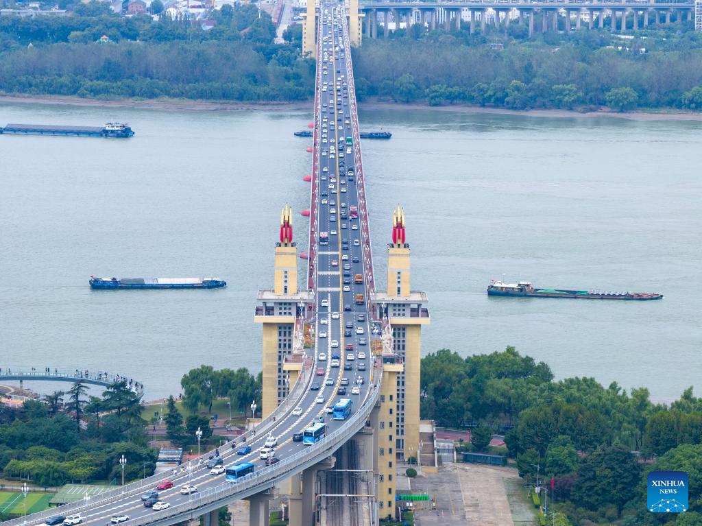 BEIJING, 1 octubre, 2024 (Xinhua) -- Vista aérea tomada con un dron el 1 de octubre de 2024 del tráfico en el puente sobre el río Yangtze de Nanjing, en Nanjing, en la provincia de Jiangsu, en el este de China. El martes marca el primer día de vacaciones con motivo del Día Nacional de China. Se espera que China gestione 175 millones de viajes de ferrocarril durante la temporada alta vacacional de diez días de duración, que van del 29 de septiembre al 8 de octubre, de acuerdo con China State Railway Group Co. (Xinhua/Yang Suping)