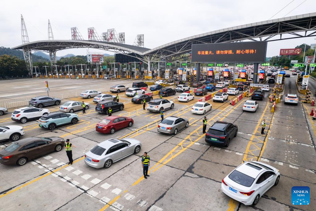 BEIJING, 1 octubre, 2024 (Xinhua) -- Vehículos son vistos cerca de una estación de peaje de una autopista, en Changsha, en la provincia de Hunan, en el centro de China, el 1 de octubre de 2024. El martes marca el primer día de vacaciones con motivo del Día Nacional de China. Se espera que China gestione 175 millones de viajes de ferrocarril durante la temporada alta vacacional de diez días de duración, que van del 29 de septiembre al 8 de octubre, de acuerdo con China State Railway Group Co. (Xinhua/Chen Sihan)