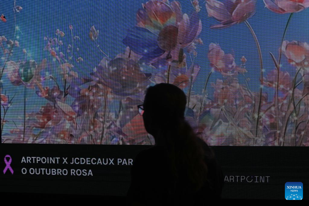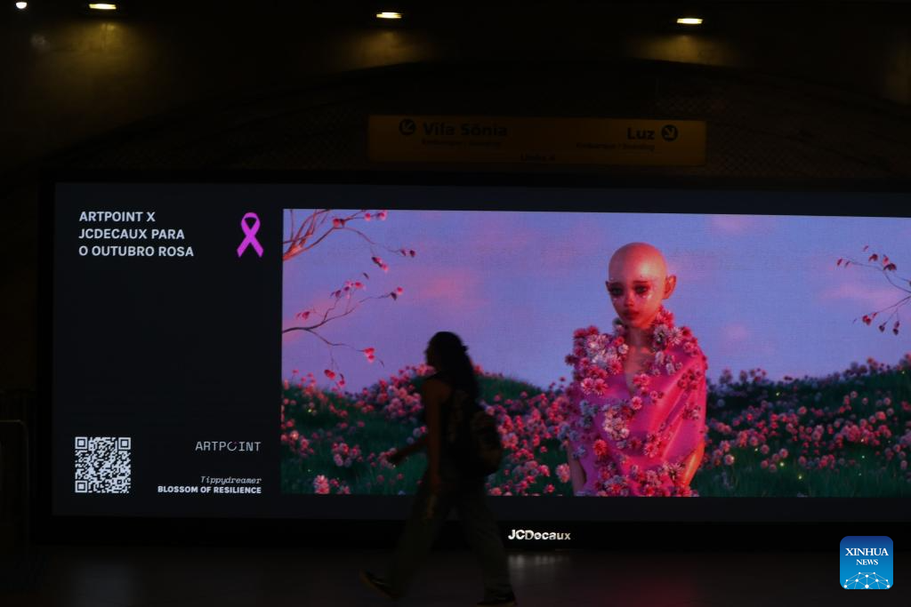 SAO PAULO, 2 octubre, 2024 (Xinhua) -- Una mujer camina frente a un tablero electrónico que exhibe obras de arte en una instalación implementada en el marco de la campaña Octubre Rosa, que tiene como objetivo crear conciencia y sensibilización sobre el cáncer de mama, en Sao Paulo, Brasil, el 2 de octubre de 2024. (Xinhua/Rahel Patrasso)