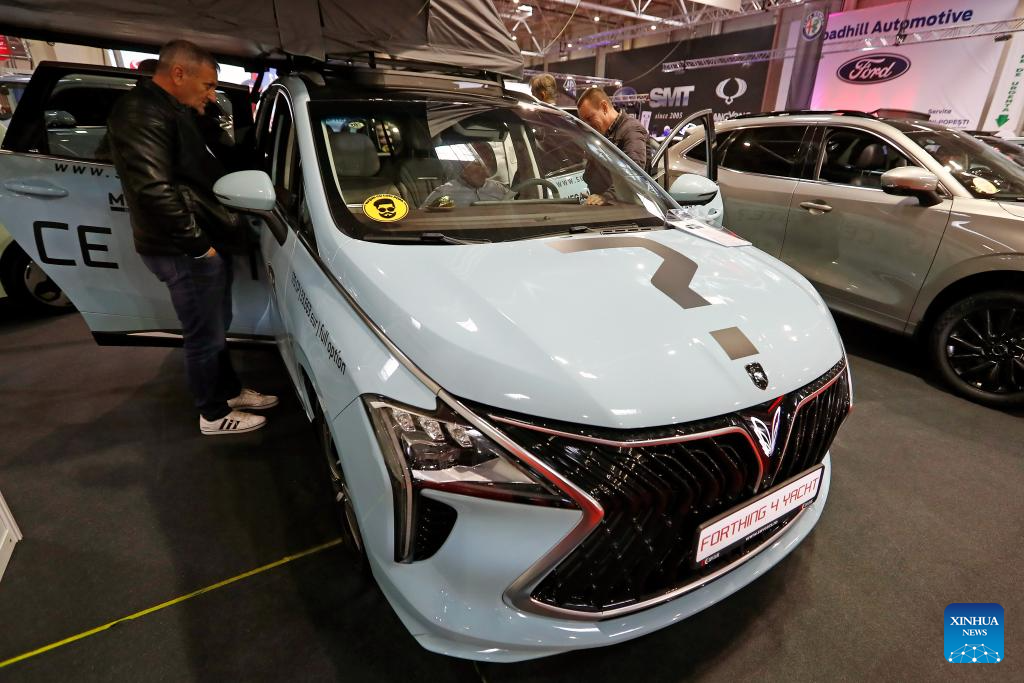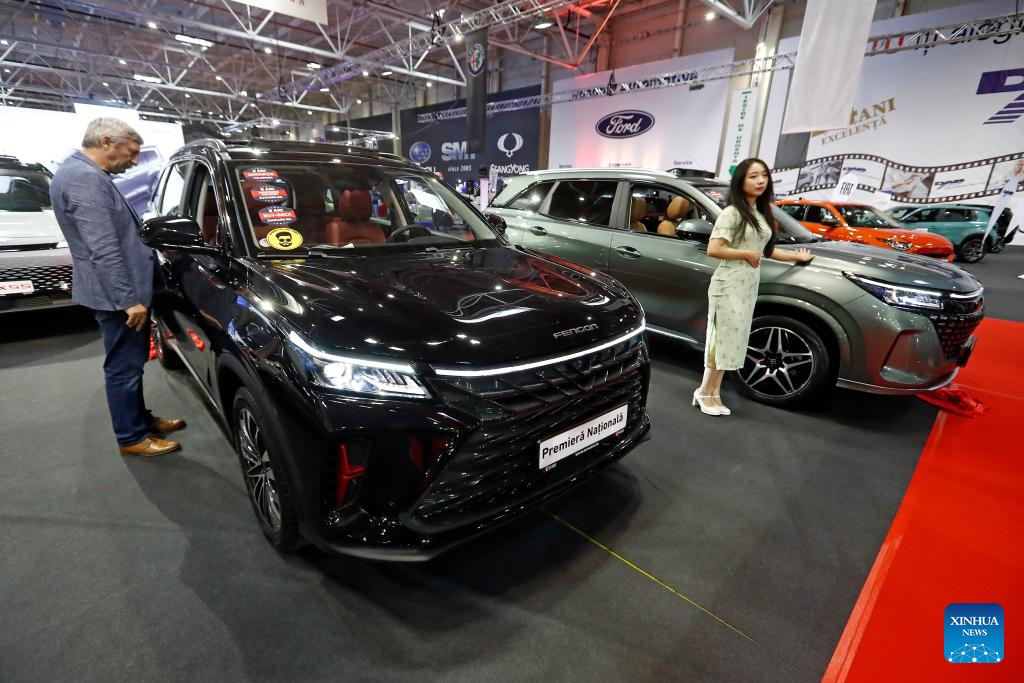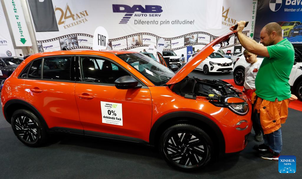 BUCAREST, 2 octubre, 2024 (Xinhua) -- Imagen del 1 de octubre de 2024 de visitantes observando un automóvil Forthing 4 Yacht del fabricante de automóviles chino Dongfeng durante el primer día del Salón del Automóvil y Accesorios de Bucarest (SAB), en Bucarest, Rumania. Decenas de vehículos convencionales, híbridos y eléctricos, y más de 600 marcas de los sectores de equipamiento, lavado de automóviles en autoservicio, repuestos, accesorios y servicios se exhiben en la exposición hasta el 6 de octubre. (Xinhua/Cristian Cristel)