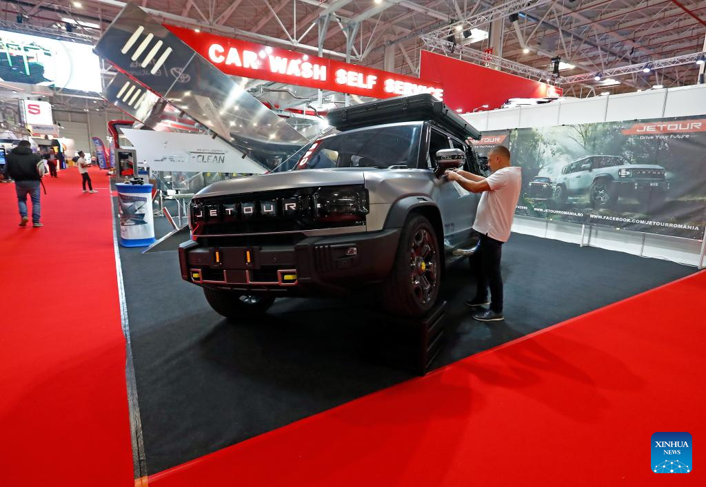 BUCAREST, 2 octubre, 2024 (Xinhua) -- Imagen del 1 de octubre de 2024 de un SUV Jetour T2 Traveller del fabricante de automóviles chino Jetour Auto exhibido durante el primer día del Salón del Automóvil y Accesorios de Bucarest (SAB), en Bucarest, Rumania. Decenas de vehículos convencionales, híbridos y eléctricos, y más de 600 marcas de los sectores de equipamiento, lavado de automóviles en autoservicio, repuestos, accesorios y servicios se exhiben en la exposición hasta el 6 de octubre. (Xinhua/Cristian Cristel)