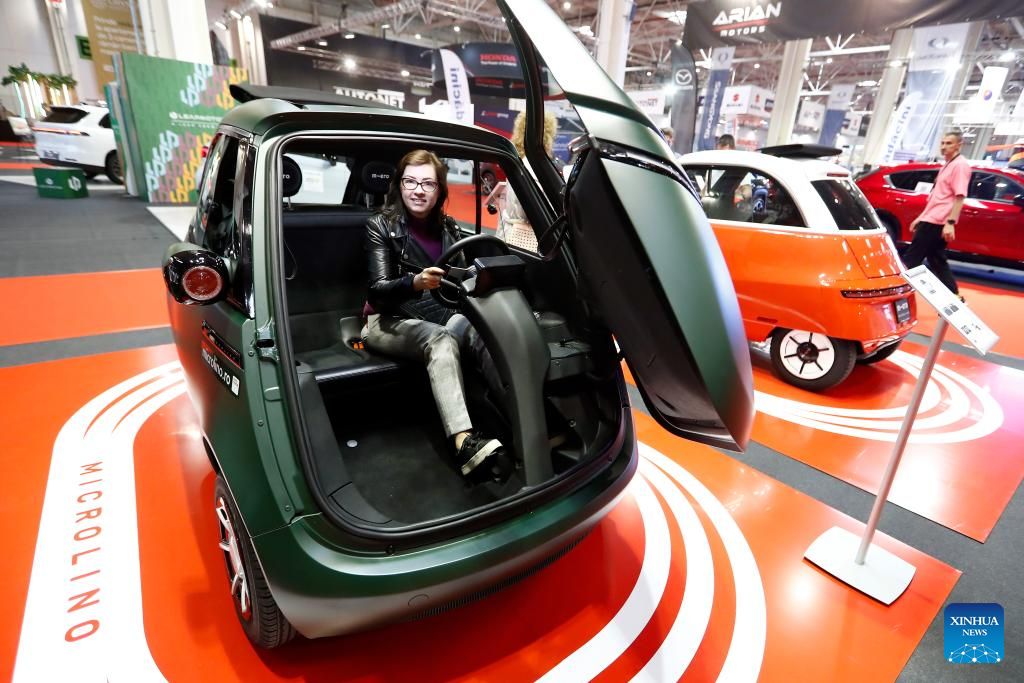 BUCAREST, 2 octubre, 2024 (Xinhua) -- Imagen del 1 de octubre de 2024 de una visitante posando para fotografías dentro de un automóvil Microlino durante el primer día del Salón del Automóvil y Accesorios de Bucarest (SAB), en Bucarest, Rumania. Decenas de vehículos convencionales, híbridos y eléctricos, y más de 600 marcas de los sectores de equipamiento, lavado de automóviles en autoservicio, repuestos, accesorios y servicios se exhiben en la exposición hasta el 6 de octubre. (Xinhua/Cristian Cristel)