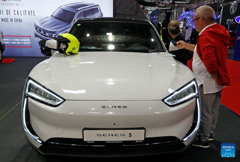 BUCAREST, 2 octubre, 2024 (Xinhua) -- Imagen del 1 de octubre de 2024 de un visitante observando un automóvil SERES 5 del fabricante de automóviles chino Seres Group durante el primer día del Salón del Automóvil y Accesorios de Bucarest (SAB), en Bucarest, Rumania. Decenas de vehículos convencionales, híbridos y eléctricos, y más de 600 marcas de los sectores de equipamiento, lavado de automóviles en autoservicio, repuestos, accesorios y servicios se exhiben en la exposición hasta el 6 de octubre. (Xinhua/Cristian Cristel)