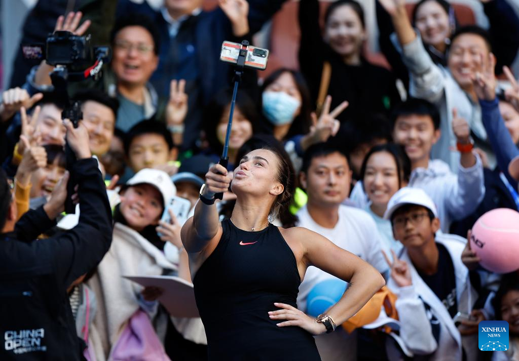 BEIJING, 2 octubre, 2024 (Xinhua) -- Aryna Sabalenka, de Bielorrusia, se toma fotografías luego de ganar el partido de octavos de final de individuales femeninos entre Aryna Sabalenka, de Bielorrusia, y Madison Keys, de Estados Unidos, en el torneo de tenis Abierto de China 2024, en Beijing, capital de China, el 2 de octubre de 2024. (Xinhua/Wang Lili)