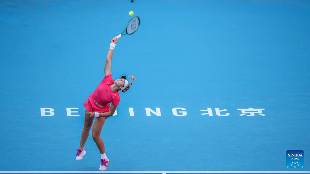 BEIJING, 2 octubre, 2024 (Xinhua) -- Zheng Qinwen sirve la pelota durante el partido de octavos de final de individuales femeninos entre Amanda Anisimova, de Estados Unidos, y Zheng Qinwen, de China, en el torneo de tenis Abierto de China 2024, en Beijing, capital de China, el 2 de octubre de 2024. (Xinhua/Bai Xuefei)