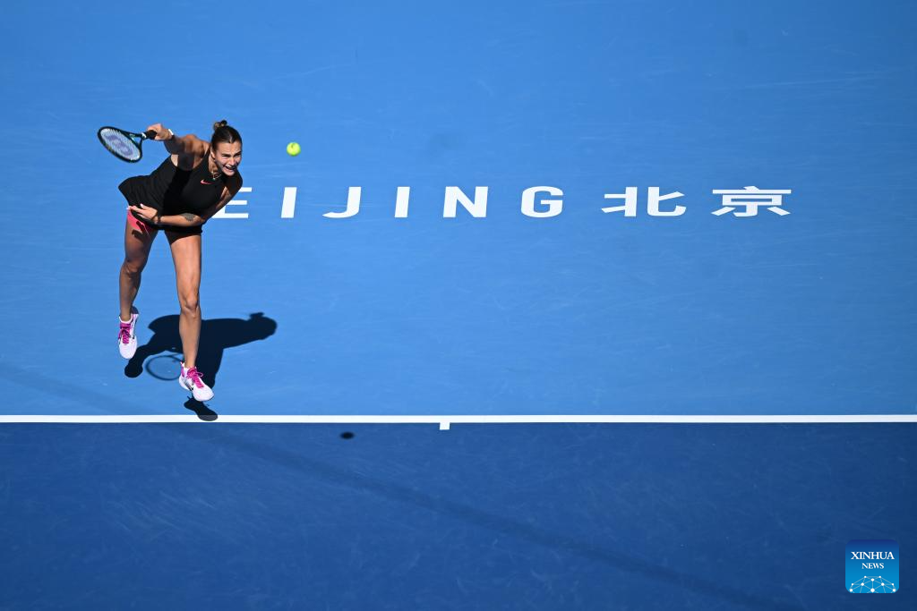 BEIJING, 2 octubre, 2024 (Xinhua) -- Aryna Sabalenka, de Bielorrusia, sirve la pelota durante el partido de octavos de final de individuales femeninos entre Aryna Sabalenka, de Bielorrusia, y Madison Keys, de Estados Unidos, en el torneo de tenis Abierto de China 2024, en Beijing, capital de China, el 2 de octubre de 2024. (Xinhua/Zhang Long)