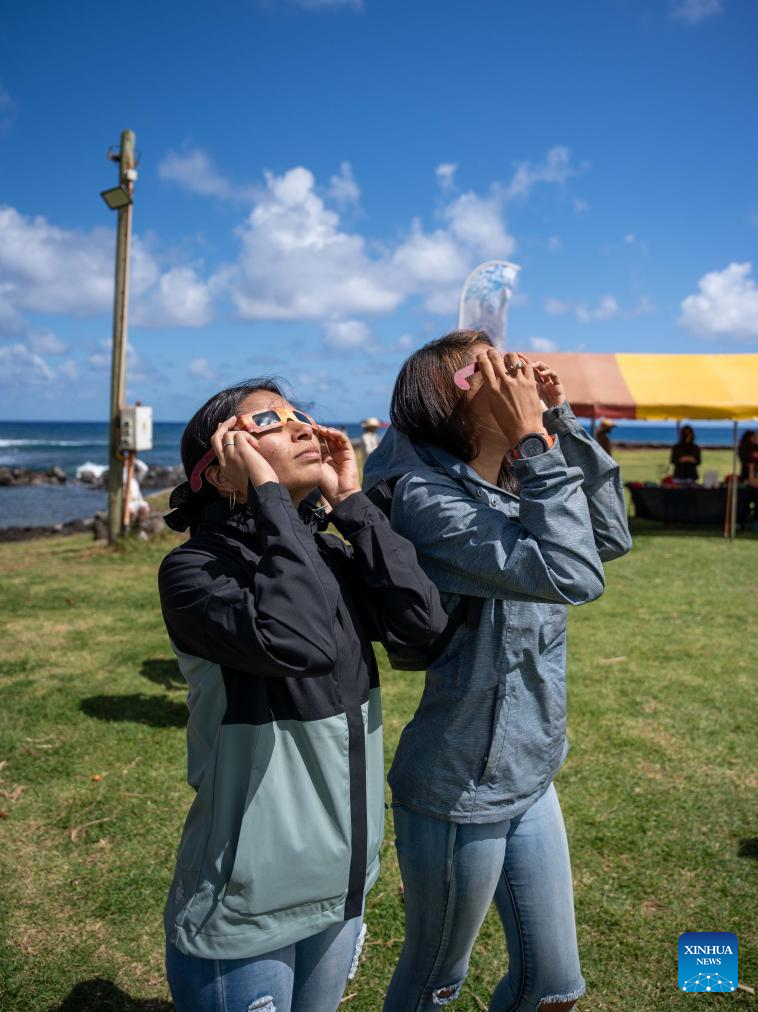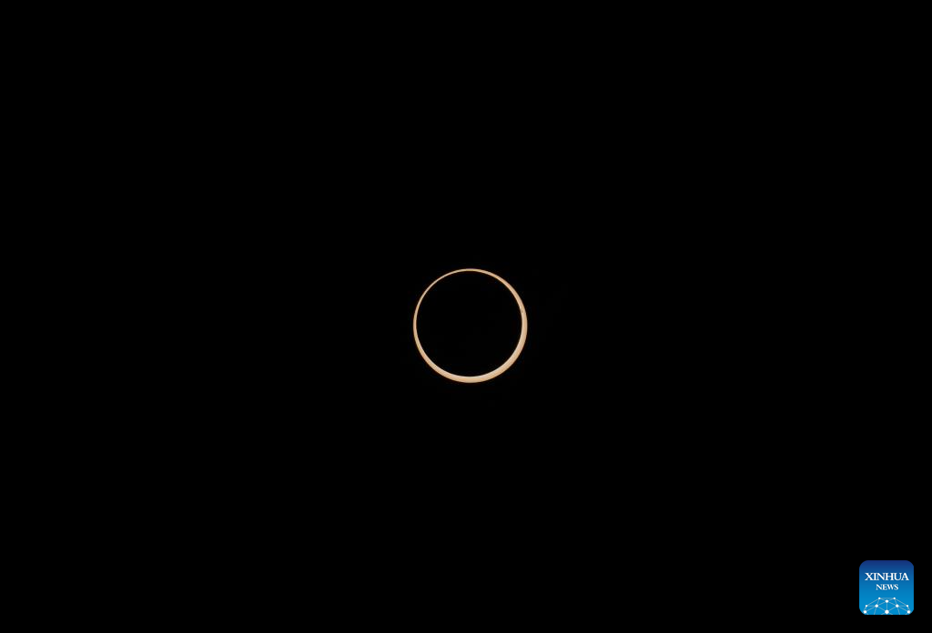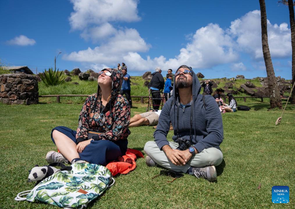 ISLA DE PASCUA, 2 octubre, 2024 (Xinhua) -- Personas utilizan lentes especiales para observar el eclipse anular de sol, en la Isla de Pascua, Chile, el 2 de octubre de 2024. (Xinhua/Str)