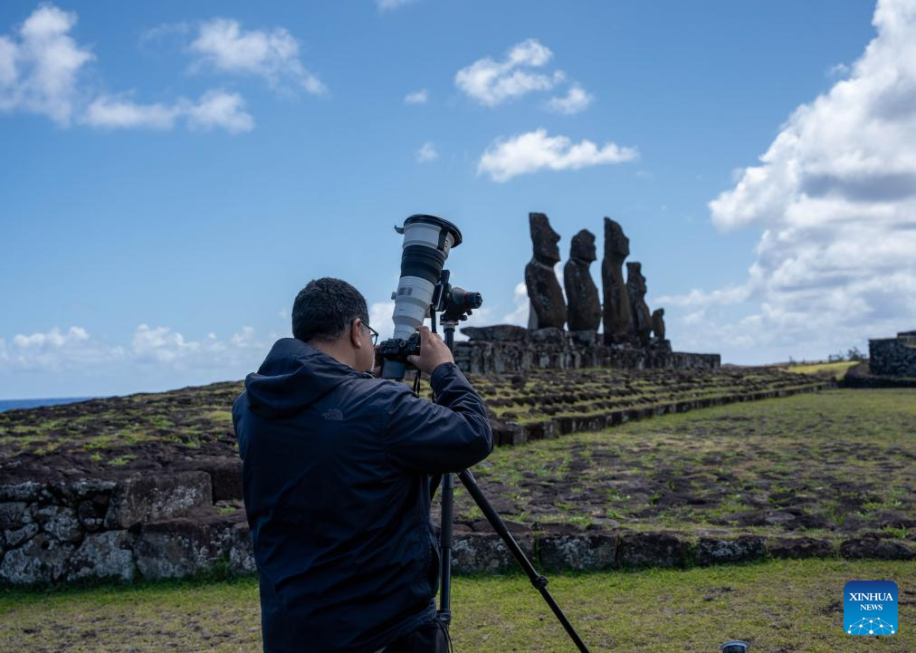 ISLA DE PASCUA, 2 octubre, 2024 (Xinhua) -- Un fotógrafo trabaja durante el eclipse anular de sol, en la Isla de Pascua, Chile, el 2 de octubre de 2024. (Xinhua/Str)