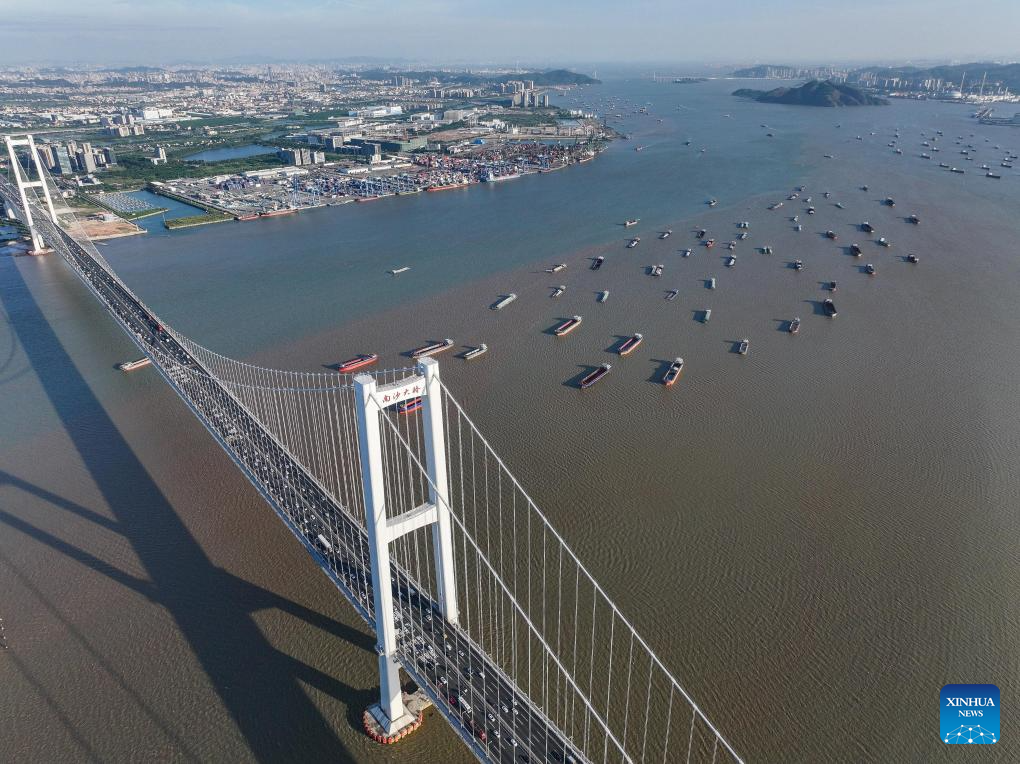 GUANGZHOU, 3 octubre, 2024 (Xinhua) -- Vista aérea tomada con un dron el 2 de octubre de 2024 del puente Nansha, que conecta la ciudad de Guangzhou y la ciudad de Dongguan, y barcos a lo largo del canal de Shiyizang, en el área del Estuario del Río de las Perlas, en la provincia de Guangdong, en el sur de China. (Xinhua/Liu Dawei)
