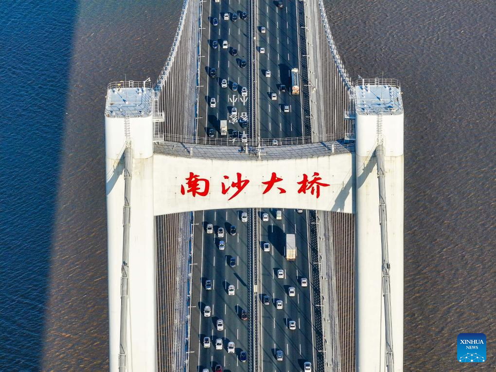 GUANGZHOU, 3 octubre, 2024 (Xinhua) -- Vista aérea tomada con un dron el 2 de octubre de 2024 del puente Nansha, que conecta la ciudad de Guangzhou y la ciudad de Dongguan, en la provincia de Guangdong, en el sur de China. (Xinhua/Liu Dawei)
