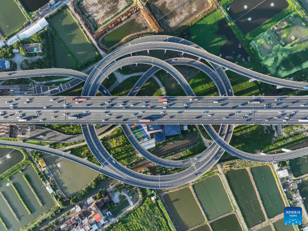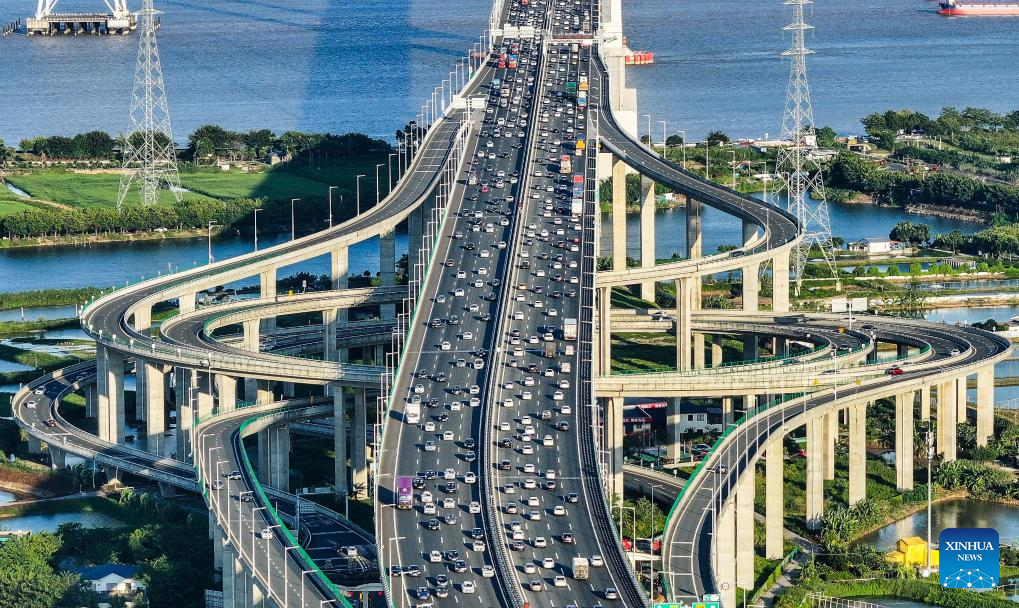 GUANGZHOU, 3 octubre, 2024 (Xinhua) -- Vista aérea tomada con un dron el 2 de octubre de 2024 de un paso elevado de intercambio en el puente Nansha, que conecta la ciudad de Guangzhou y la ciudad de Dongguan, en la isla de Haiou, en el área del Estuario del Río de las Perlas, en Guangzhou, en la provincia de Guangdong, en el sur de China. (Xinhua/Liu Dawei)