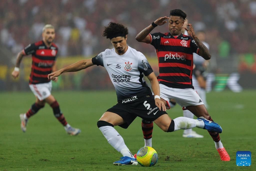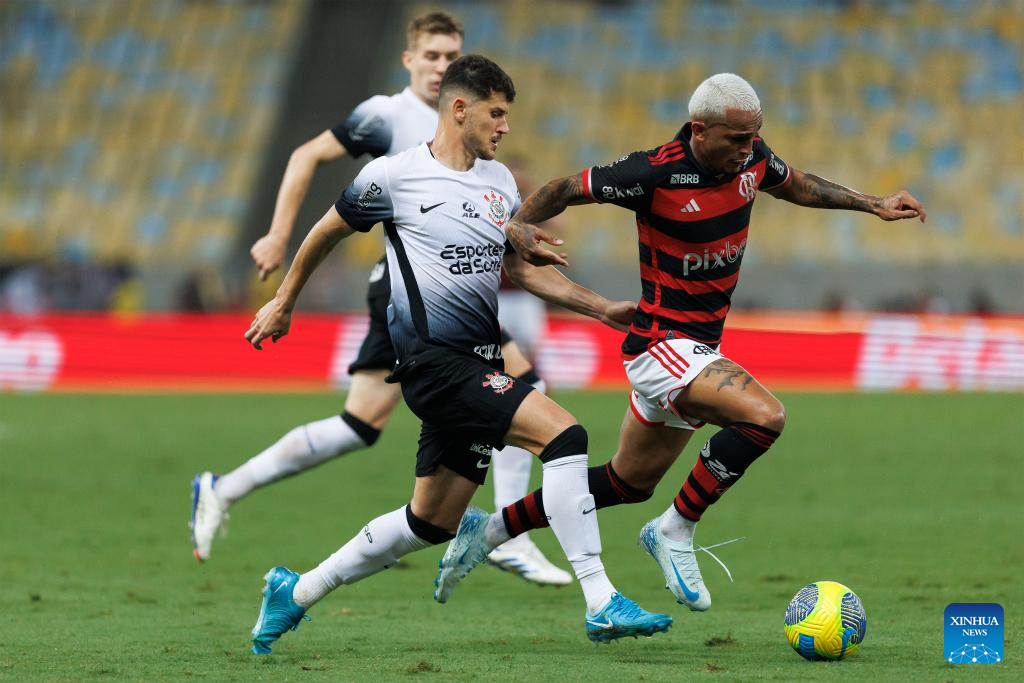 RIO DE JANEIRO, 3 octubre, 2024 (Xinhua) -- Imagen del 2 de octubre de 2024 del jugador Wesley (d), de Flamengo, disputando el balón con Hugo (i), de Corinthians, durante el partido de ida correspondiente a la semifinal de la Copa de Brasil, celebrado en el Estadio Maracaná, en Río de Janeiro, Brasil. (Xinhua/Claudia Martini)
