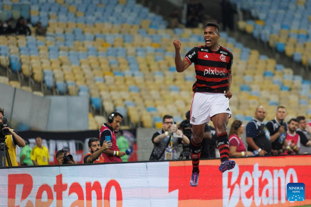 RIO DE JANEIRO, 3 octubre, 2024 (Xinhua) -- Imagen del 2 de octubre de 2024 del jugador Alex Sandro, de Flamengo, festejando su anotación durante el partido de ida correspondiente a la semifinal de la Copa de Brasil, ante Corinthians, celebrado en el Estadio Maracaná, en Río de Janeiro, Brasil. (Xinhua/Claudia Martini)